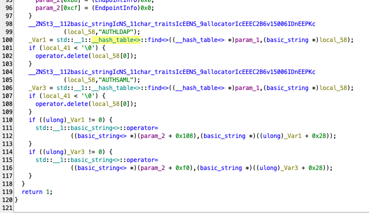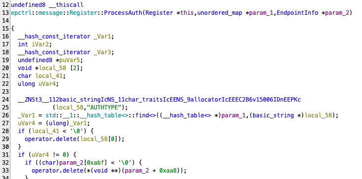 At epctrl::message::Register::ProcessAuth in case the AUTHTYPE field exists in the response, the parameters will be reset including auth_user (the truncated part of the image, lines 34-96), and it will load AUTHLDAP and AUTHSAML key/value from the response to auth_ldap and auth_saml correspondingly.