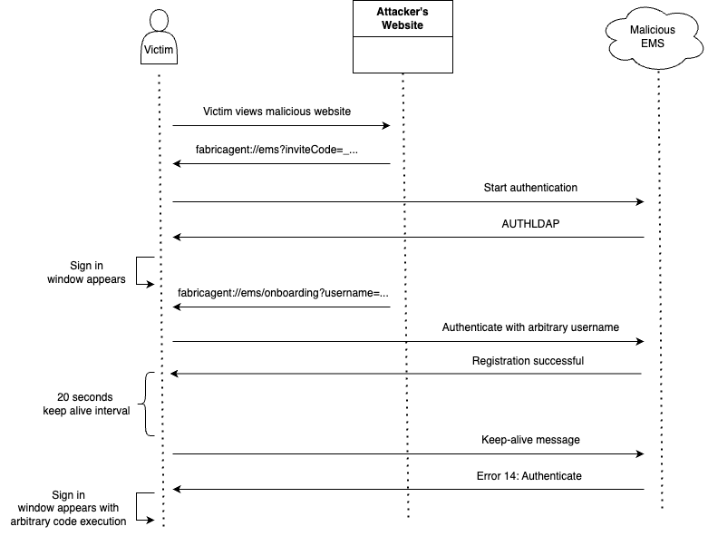 The FortiClient Electron app handles URLs of the scheme fabricagent://. By using the fabricagent://ems?inviteCode=... URL, FortiClient will connect to an on-premise or Fortinet-hosted server depending on if the inviteCode parameter starts with a _ character. The code is a base64-encoding of the following format - <version>:<fqdn>:<port?>:<vdom>:<invitation_code> (fqdn == the IP of the EMS).
